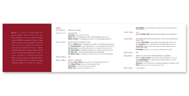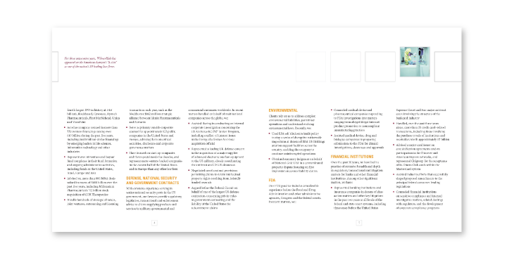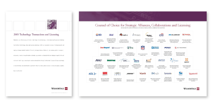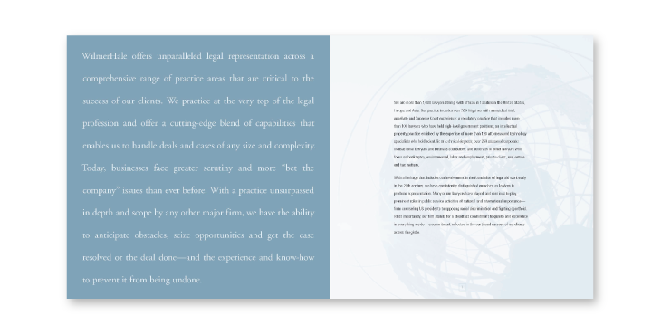 At WilmerHale LLP, a global law firm, I worked with the design and marketing teams to create a new visual identity for the firm. To build this new brand, I designed marketing materials, including brochures, advertising and a stationery system, and selected all photography, maintaining a look and feel that adhered to the new style guide.